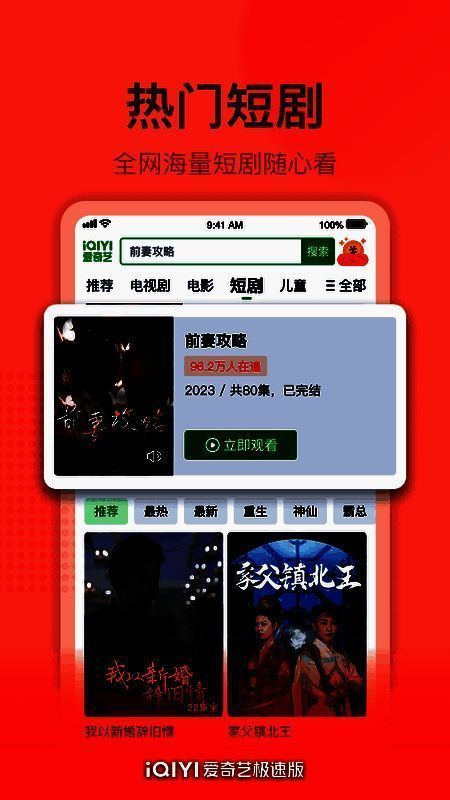 爱奇艺极速版正式版是一款备受青睐的在线追剧软件。它有着丰富多元的影视资源,涵盖电视剧、电影、综艺、动漫等,用户能自由挑选并轻松在线播放心仪影视剧。软件提供丰富影视分类,可快速筛选查看,还能呈现热门剧集与电影,便于灵活点播。其内置强大搜索方式,检索精彩影片轻而易举,能带来流畅追剧体验。