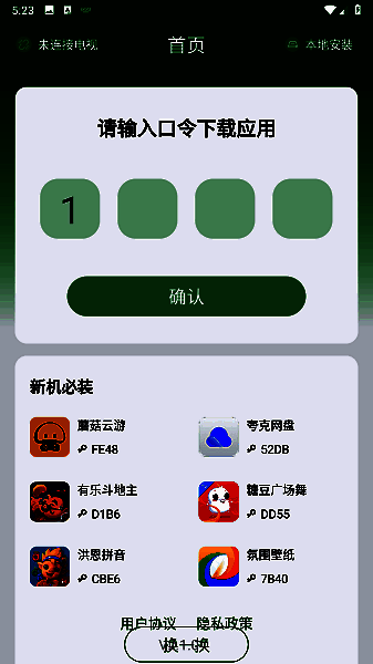 打开野草助手app,输入口令后点击确定(具体口令参考下文)。