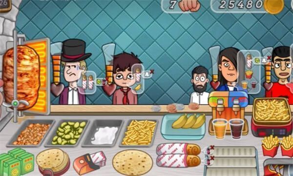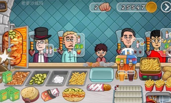 老爹沙威玛是一款充满趣味的休闲益智经营模拟游戏。玩家能在游戏里模拟经营一家烤肉卷饼店,核心玩法是制作并售卖沙威玛卷饼。可花金币升级机器设备提升制作效果,烤架上的肉需操控刀片割取。游戏左侧能点击“员工”帮忙上货,右侧有炸薯条机和饮料机。