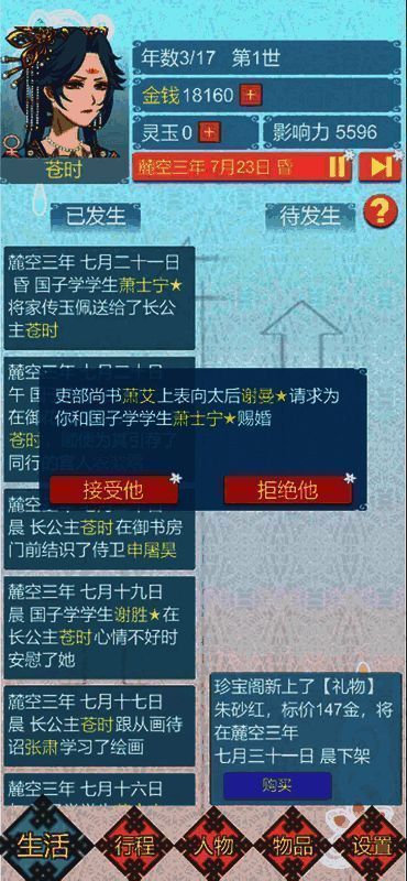 5、随后自动开始剧情故事,左侧是已发生事件,右侧是待发生随机事件,需自由做出选择,不同选择影响未来命运。
