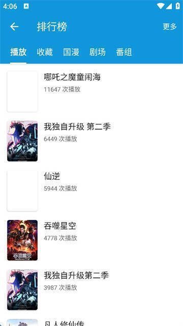 3、排行榜可让你知道最受欢迎的动漫,有播放、收藏、国漫、剧场、番组等榜单,例如播放第一的是鬼灭之刃剧场版无限列车篇。