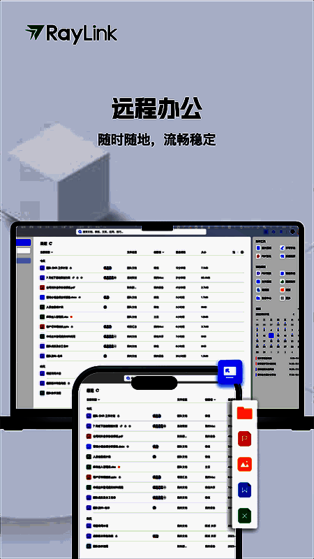 RayLink 官网入口所对应的远程控制办公软件,能实现文件的快速安全传输,有直接连接和转发两种方式。直接连接无速度限制,转发方式限速 20Mbps,无论大小文件传输都快,能充分满足远程工作需求。它还可远程控制计算机或手机,操作简单,登录即可开启远程连接,连接成功后能进入远程主机桌面执行操作。控制端可设置清晰度、颜色和帧率等参数,手机支持多种控制模式。
