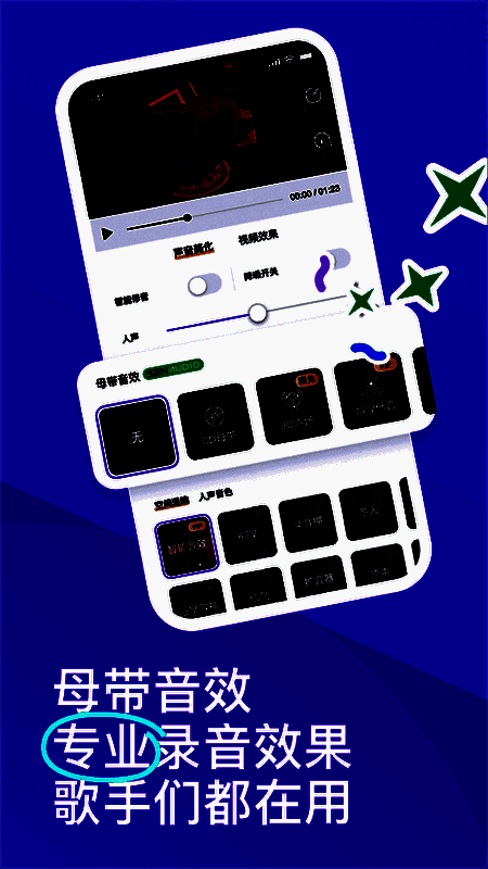 2. 带来更舒适的K歌体验,具备实验室级专业K歌音效,支持智能上下调音、一键声音校正,搭配超时尚音乐视频模板、特效和图像匹配,解决唱歌的各种小烦恼。