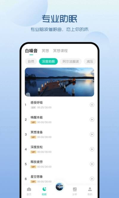 2. 智能助眠:APP内白噪音能智能辅助入睡,睡眠音乐丰富,可在线选播。