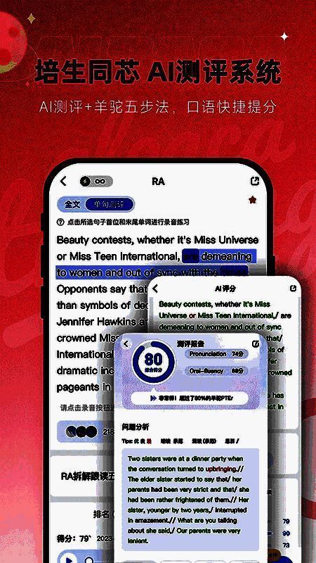 4. 有RA/RS/RL/DI/ASQ/词汇等口语练习评估功能,能暴露考生口语弱点,提供总分、流利度和发音分数供参考。