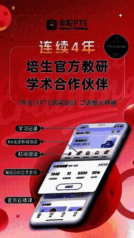 PTE羊驼集成人工智能口语评估、数据库更新、练习签到与互动社区,紧跟考场趋势和新题更新,适用于PTE、雅思和托福考生口语阅读练习。有大量题料助考生巩固题型规则、改进不足,适用于笔试和口语测试。
