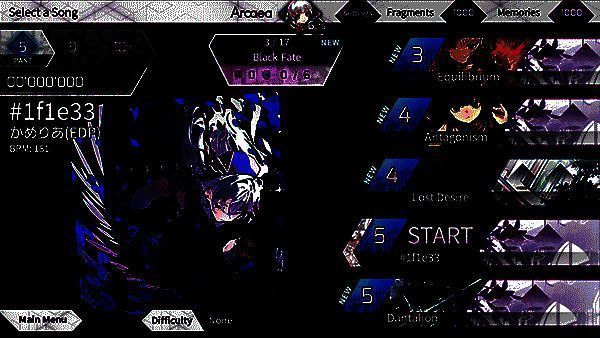 4、基础通关判定为屏幕左侧的回忆收集条满70%即可通关,首次收集满70%时会有音效提示。不同人物技能会改变通关难度。例如初始光技能为“简单”,可减少lost时丢失的回忆收集率,使用她通关判定为Easy Clear(绿C);初始对立无技能,通关判定为Normal Clear(紫C);拥有“困难”技能的角色,如伞对立,回忆条开局即满,变为0时强制中止游戏,使用这类角色通关判定为Hard Clear(红C),Hard Clear只要回忆率大于0即可获得。Full Recall(字母F)需无lost,Pure Memory(字母P)要在fc基础上无far全pure。