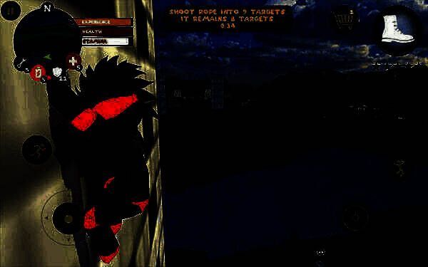 左侧控制移动、加速,右侧控制绳索、攻击(跳跃)、跳跃,右上侧可更换武器,血量、经验实时更新。玩家可自由玩法,与其他帮派人物交火,杀人获经验,杀多会有星级,警察和附近角色会攻击玩家,玩家要完成存活和击杀他人的任务。