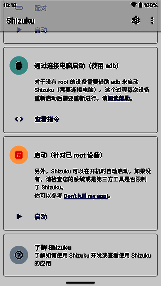 若设备未root,也可遵照shizukumanager中的指引,通过adb启动服务。使用adb并不难,网络上有不少教程可帮助学习。