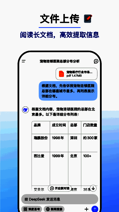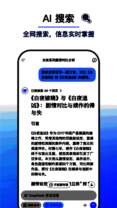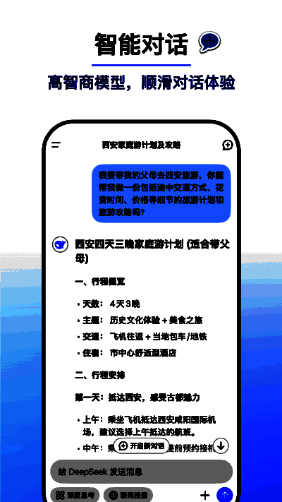 DeepSeek是一款功能强大的人工智能工具,它依托先进的自然语言处理(NLP)技术,具备理解、分析和生成高质量文本内容的能力,适用于多种不同场景。该软件提供精准的问答服务,支持上传多种格式的文件,并能从中提取文字信息,还可对文件内容进行总结、分析或生成报告。其强大的数据分析功能有助于用户从海量文本数据里提取关键信息,生成可视化报告。DeepSeek App适用场景广泛,感兴趣的朋友不妨下载体验。