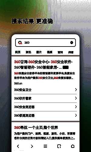 360搜索下载安装手机版是一款极为出色的免费搜索软件。它能为用户提供便捷的网页搜索服务,用户可轻松了解最新新闻、小说、视频等内容,并自由选择观看阅读。该软件还会推送优质内容,满足用户兴趣。它自带丰富的网页标签和书签栏,能收藏保存喜欢的网页。拥有极速搜索引擎,确保顺利搜索网页内容,让用户随时浏览最新网页。