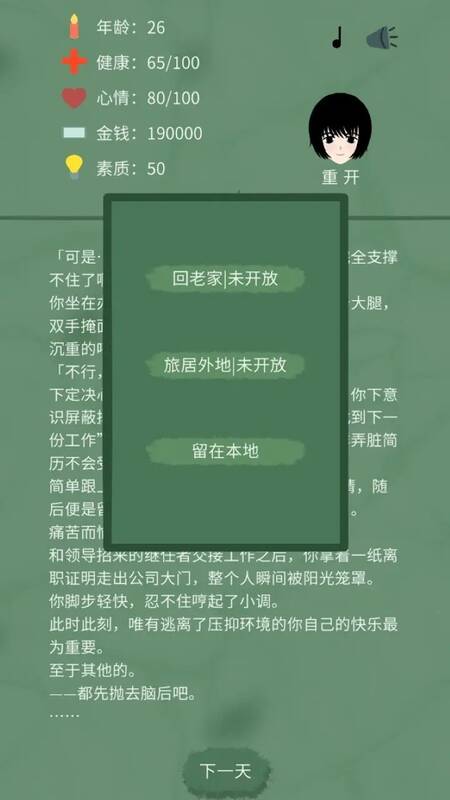 游戏玩法简单直观,玩家每个选择都影响最终结果。在这里能真实体验裸辞后生活,感受决策连锁反应。快来开启这场梦想与现实的冒险,探索自己的人生道路。