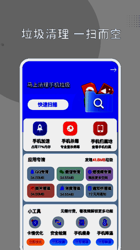 1. 垃圾清理:快速扫描清理手机垃圾文件、缓存、残留文件、无用安装包等,释放空间,提升性能。
