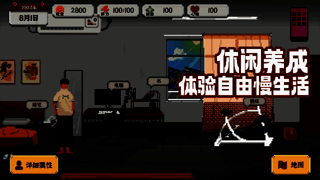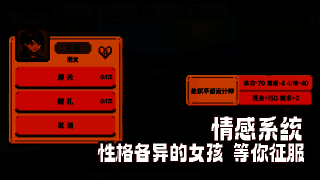 游戏玩法无强制目标,除失败结局外,玩家可自由选择赚钱路线、培养NPC好感度,部分重要NPC背后有独特故事。每局无时间限制,但有月固定支出,支出会随玩家决策提高。当玩家觉得条件达成,可手动结束游戏进入结局,如结婚或一直搞钱和好基友相伴等。结局多样,受达成时间、结婚对象、表现及成就等因素影响。目前赚钱玩法有务农(建仓库、买农具、耕种售卖等)、游戏从业者(打比赛、接单子、做直播)、考公玩法(考公务员、职称)、UI设计师(设计作品售卖或接订单,可开工作室当老板)。游戏中随机事件会影响生活。