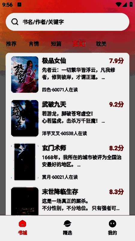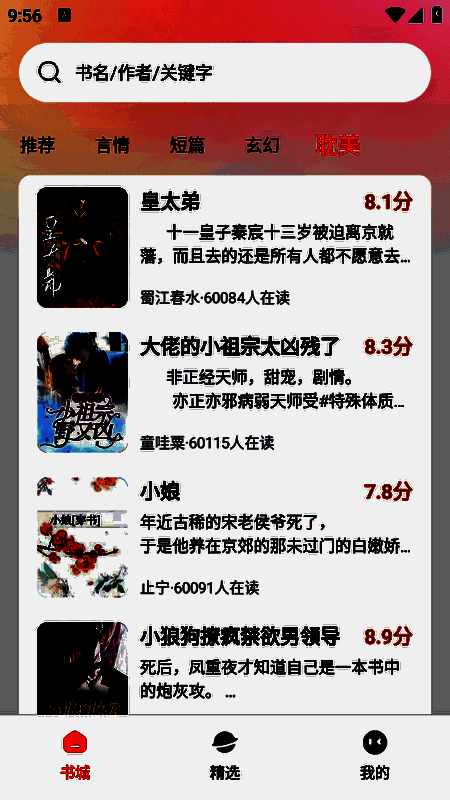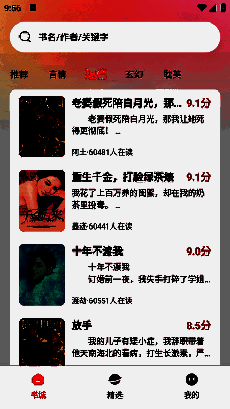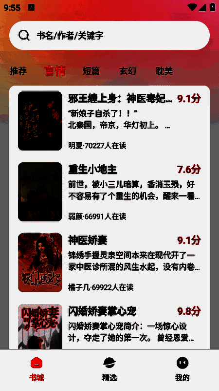 3、“精选”板块,提供热门小说资源,可对小说进行评价。
