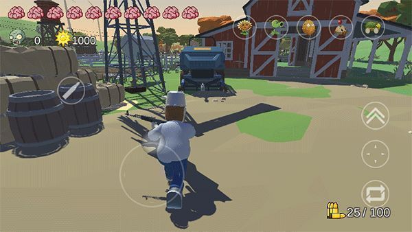 5、左上角“大脑”代表生命值,底部显示已击杀僵尸数量和阳光数,滑动右侧屏幕可旋转视角,还有跳跃、瞄准、换弹等快捷按钮。