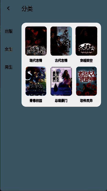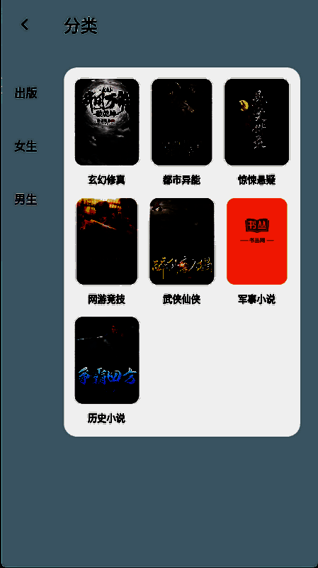 2、“书城”页面小说分类详细,各种类型一应俱全。