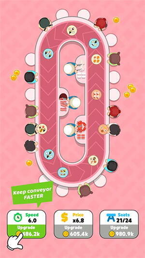 游戏氛围轻松愉快,采用可爱的卡通画风,色彩鲜艳的食材和寿司令人垂涎。独特的旋转寿司模式带来与传统经营不同的乐趣,操作简单却富有挑战。丰富的食材和寿司种类可满足顾客不同偏好,还有店铺升级系统,玩家能通过赚金币提升设备、扩大店面、解锁新食谱和装饰。
