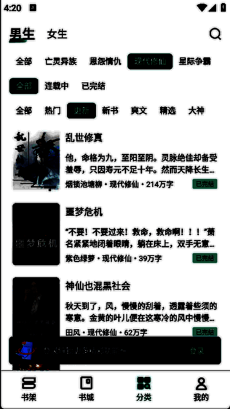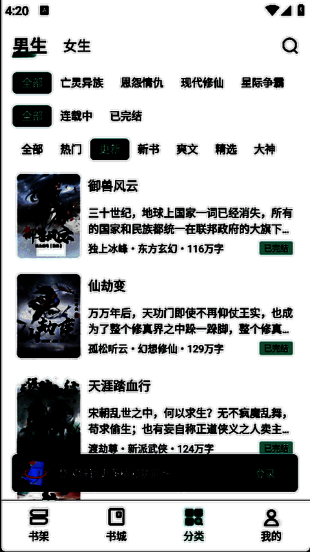 2、进入首页后,能看到丰富的小说资源和详细的小说分类,无论男生女生都能找到适合自己的。
