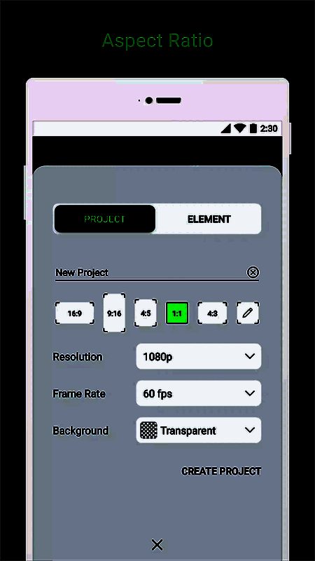 2、接着选择创建一个项目,设置项目名称、宽高比例、分辨率、帧速率、背景颜色。