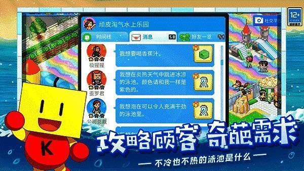 此游戏延续开罗游戏一贯风格,玩法与其他系列相似。玩家需逐步建设水上公园,有多种场景构建玩法,如扩建泳池、建造厕所等。还能种植绿植增添活力,通过社交与客人交友,按其意愿打造设施,让客人满意。