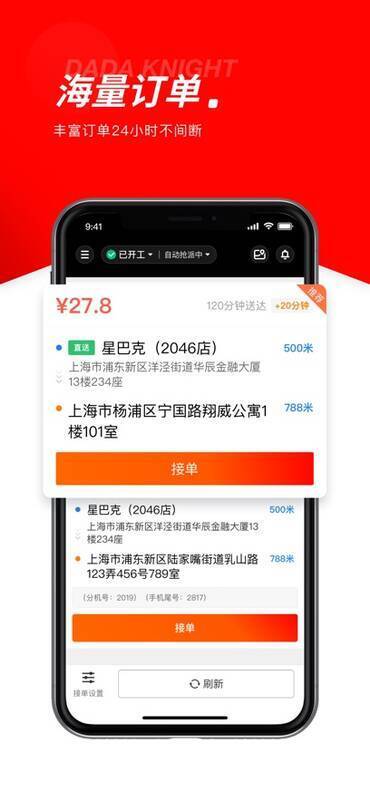 2、24小时订单推送,随时可接单,有夜间津贴。