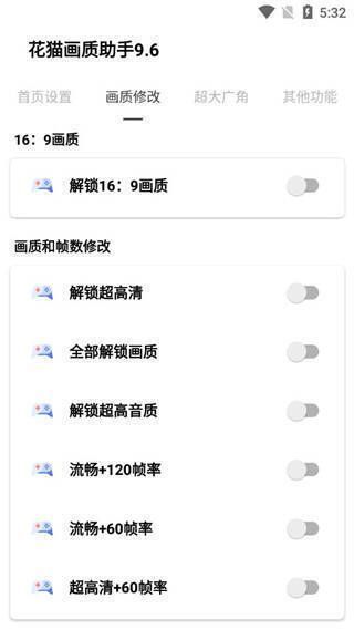 2、点击画质修改,玩家能使用解锁16:9画质、解锁超高清、全部解锁画质、解锁超高音质、流畅+120+60帧率、超高清+60帧率等功能;