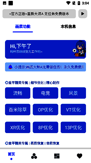 画质大师Aapp免费版是一款极为实用的游戏质量修改器应用。它具备强大优化功能、灵活自定义设置、智能自动识别能力,还能节能省电,为游戏爱好者全方位提升游戏品质。玩家通过一键优化,能快速选适配装备的方案,无需复杂操作,可适应多样游戏风格与装备类型。