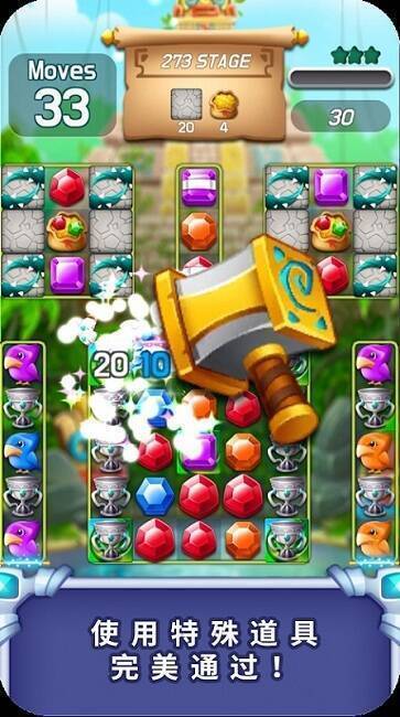 - 各关卡目标不同,如消除指定宝石、收集特定物品或达到一定分数,玩家要依目标制定策略。