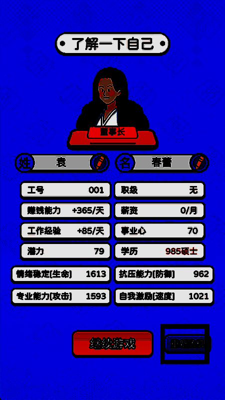 1、进入游戏首先是选择自己的角色身份,每个人物的属性都不一样,可以点击右下角的重新随机更换人物,选择好后点击继续游戏。