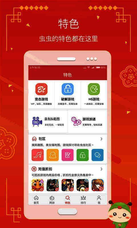虫虫助手app官网下载专注于为玩家呈上最优质、最有趣、最鲜活、最热门的游戏,设有特色游戏、BT游戏等特色板块,能满足不同年龄段、不同群体的游戏需求,堪称手游玩家的新乐园。虫虫助手app内置社区功能,这里是一群幽默玩家的游戏集结地,大家可在此交流经验、畅聊趣事,不再孤单,能与超5000W+玩家一同探讨、分享、评价游戏,快来加入体验!