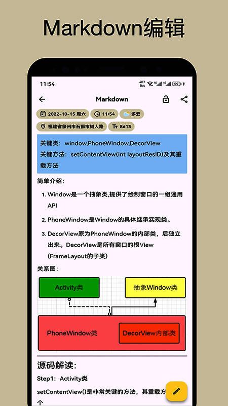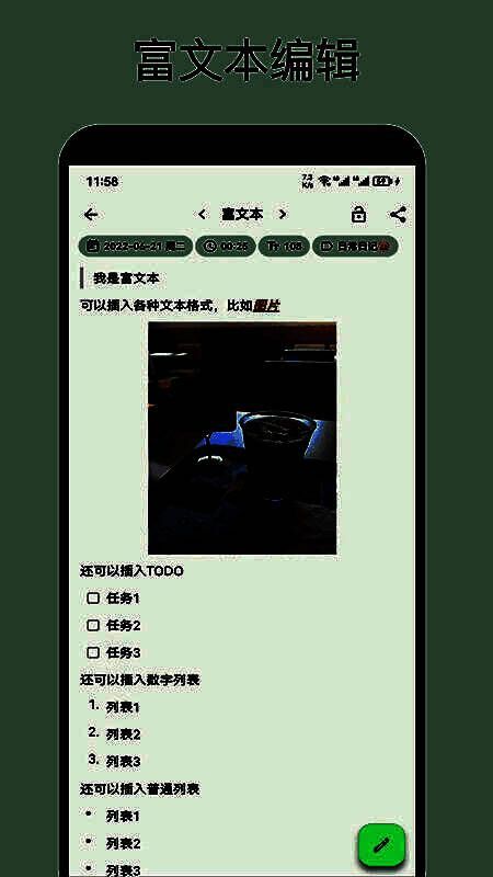 榴莲日记官方版是一款超实用的轻量级私人日记App,它可不只是简单的笔记工具,能让你迅速记录每日琐事,留存每一个珍贵瞬间、难忘事件与重要人物。软件提供简单文本、丰富文本和Markdown三种日记格式,支持用图片记录,还能自动获取当前位置地址,让日记更具特色。即便没网络,也能轻松完成记录、修改和查看操作。所有日记以时间轴展示,查阅一目了然。