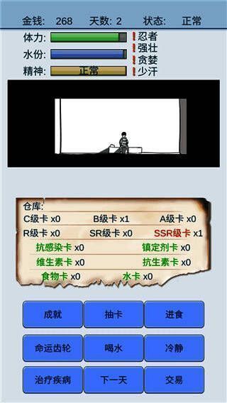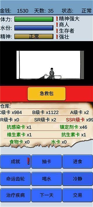 大海诞生使抽到水牌概率更高,幸存者增加抽到生存牌概率,商家能预知次日交易价格。主角有体力、水、精神三个属性,体力或水耗尽会死亡,精神分正常、抑郁、疯狂,疯狂状态可能导致睡觉或抽SSR时死亡。新版本每天有随机金额用于抽卡,抽不到高级卡会影响精神。此游戏趣味十足,快来下载体验!