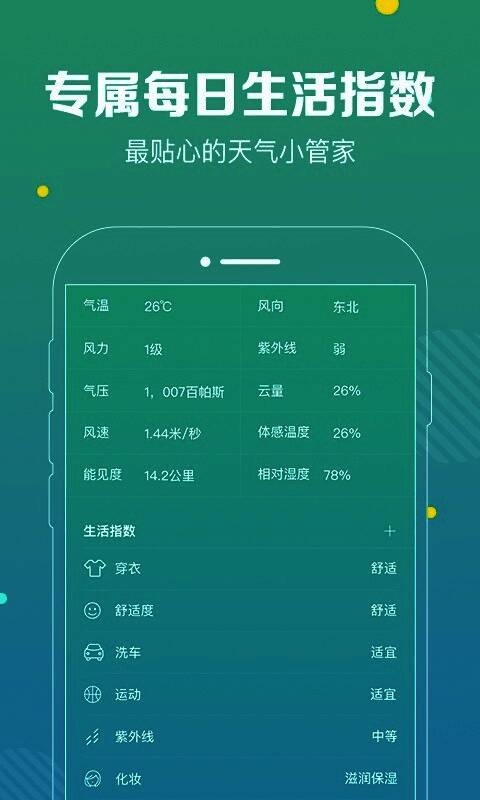 3. 丰富生活指数:具备穿衣、紫外线、运动等多种生活指数,为日常生活提供全面指导。
