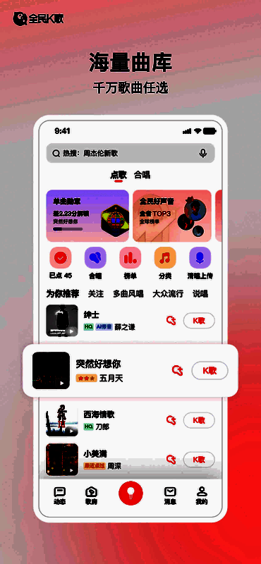 全民K歌功能丰富多样。智能修音功能可精准捕捉每个音符,巧妙修饰瑕疵,让歌声瞬间悦耳,如同有专业调音师助力;多样化音效选择,无论是深情民谣、动感摇滚还是浪漫流行风,都能一键切换,满足不同演唱风格需求。还支持与好友实时合唱,即便相隔千里,也能通过屏幕共享欢乐。