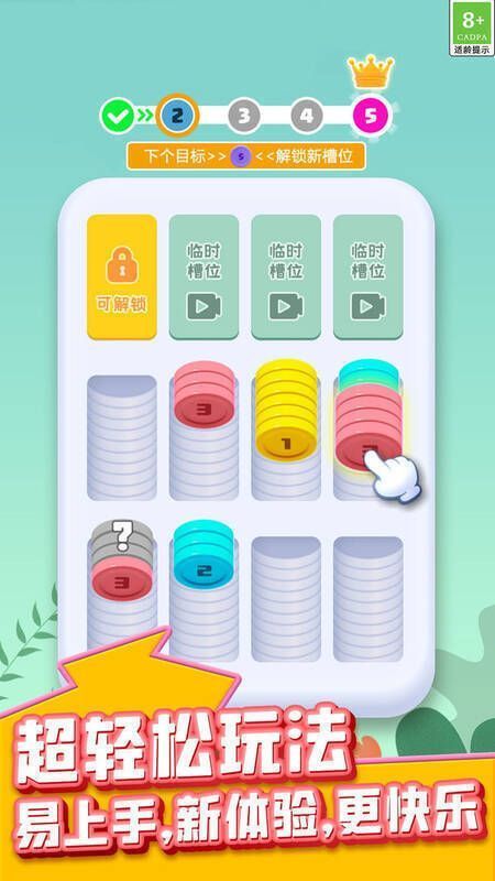 排序解压神器游戏是一款超有趣的休闲解压手游。在游戏里,你要把不同颜色的硬币分类排序,运用巧妙的移动策略完成硬币合并与归类,达成完整排列。操作简单,适合各年龄段玩家,碎片时间或想放松时都能畅玩,还能用道具加快整理、提升效率、轻松闯关。精美的画面与细腻音效,让硬币滑动合成充满治愈感,带来绝佳休闲体验。