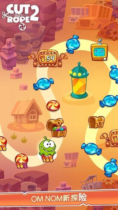 1. 玩家要剪断绳子,借助物理原理让糖果落入奥姆诺姆口中。