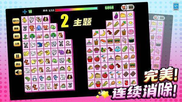 1、经典连连看:把相同图案的物品相连,消除屏幕上的图标,目标是清空所有物品。