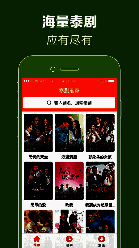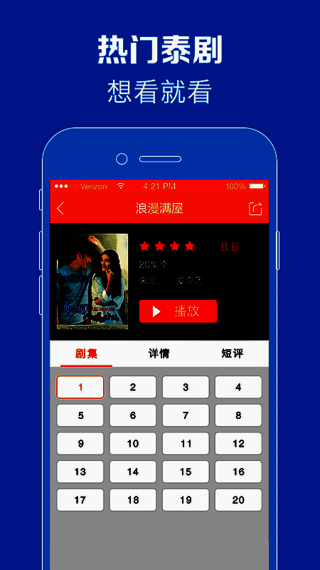 具备720p超高清图像,带来电影级视觉享受;全新“重播”键,不错过每集精彩;下载速度快,支持离线缓存,无需担忧电影质量;可给泰剧打分,查看最新评论,为喜欢的偶像打分。
