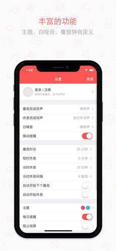【丰富的提醒】有番茄完成/休息结束的铃声、振动提醒,多种铃声和工作白噪音可选,助您沉浸工作。