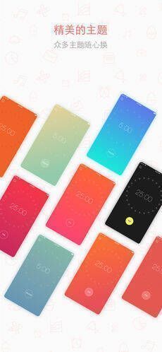 【多样主题界面】提供多样清新主题,界面以圆形番茄籽提示番茄执行进度。