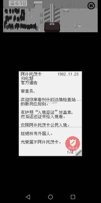 《请出示证件》是一款复古像素风的模拟解谜游戏。故事背景设定在80年代的阿什托茨卡边境,玩家化身边境检察官,负责检查入境人员文件并配合上级工作。多变的政策和形形色色的人员让工作困难重重。
