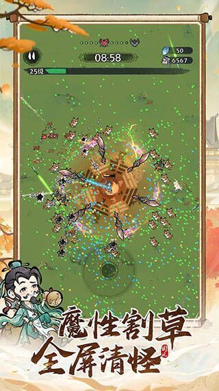 2、精彩的割草冒险战斗玩法,结合趣味内容设计,以割草和国风为突出特色。