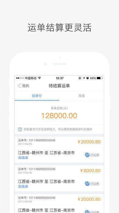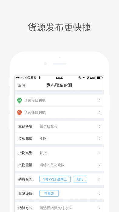 【一键发货】一键发布货源信息,智能匹配所需物流车源。【一键抢单】真实货源实时抢单,避免空车回程和苦等配货。【一键调度】轻松查看货运信息,随时调度车辆货源。【实时监督】货车货物实时定位,全程监督。【担保交易】用户注册实名认证,运费担保,省时又省心。【增值服务】提供货运险、车险、油卡、物流金融、快递、新车二手车交易等服务。
