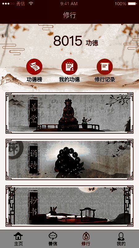 【修行】可使用善信在线进行诵持、抄经、打坐等修行活动;