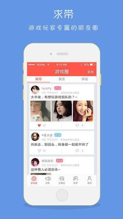 它是当下最潮流的游戏玩家交友应用,五万游戏妹子的共同之选。这里有亲密私聊、即时组队、海量比赛,让你随时随地找到身边的玩家。不管是网吧邻座的英雄联盟可爱妹子,还是同系女神,亦或是全校最强王者,《求带》都能让你轻松组队靠谱队友,邂逅知心游友,成为附近耀眼的游戏明星。