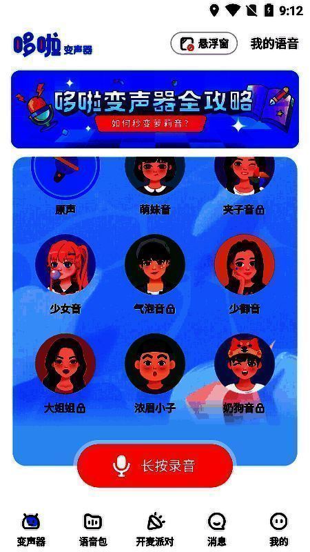 1、下载并进入多啦变声器,变声器页面有超多仿真网红音色供你挑选,选好音色后长按即可录音。