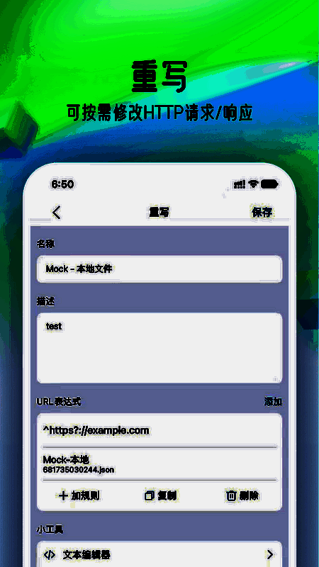 3. 重写:实时修改 HTTP / HTTPS 请求和响应,包括 URL 重定向、自定义 Header、本地/远程文件 MOCK 等。
