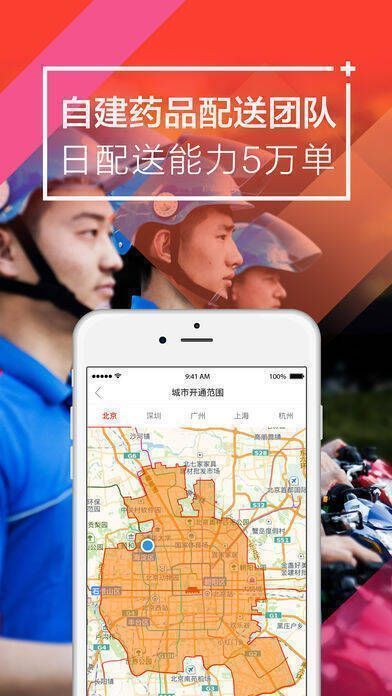 我们是专为年轻白领打造的手机买药平台,具备药监局认证的合规资质,药品 100%为正品。通过遍布一线城市的自营实体药店网络,保证所有药品 1 小时内送达。目前,自营药店服务网络覆盖北京、上海、深圳、杭州和广州,日配送能力超 5 万单,服务好评率达 99%。