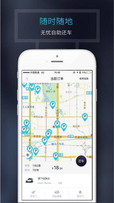 4. 可以随时自助还车,使用灵活,没有规定的租车时间,时间完全由用户掌控;还能随时自助寻车。